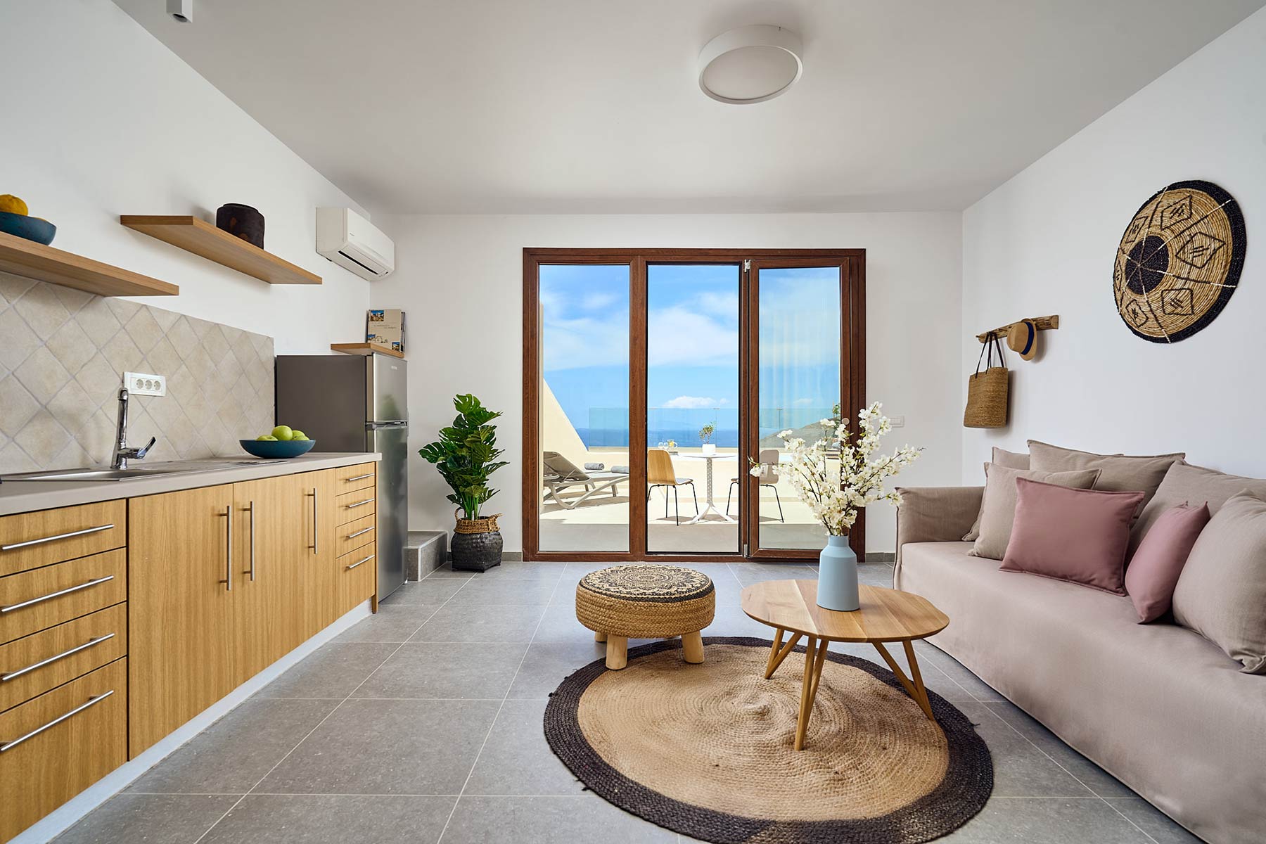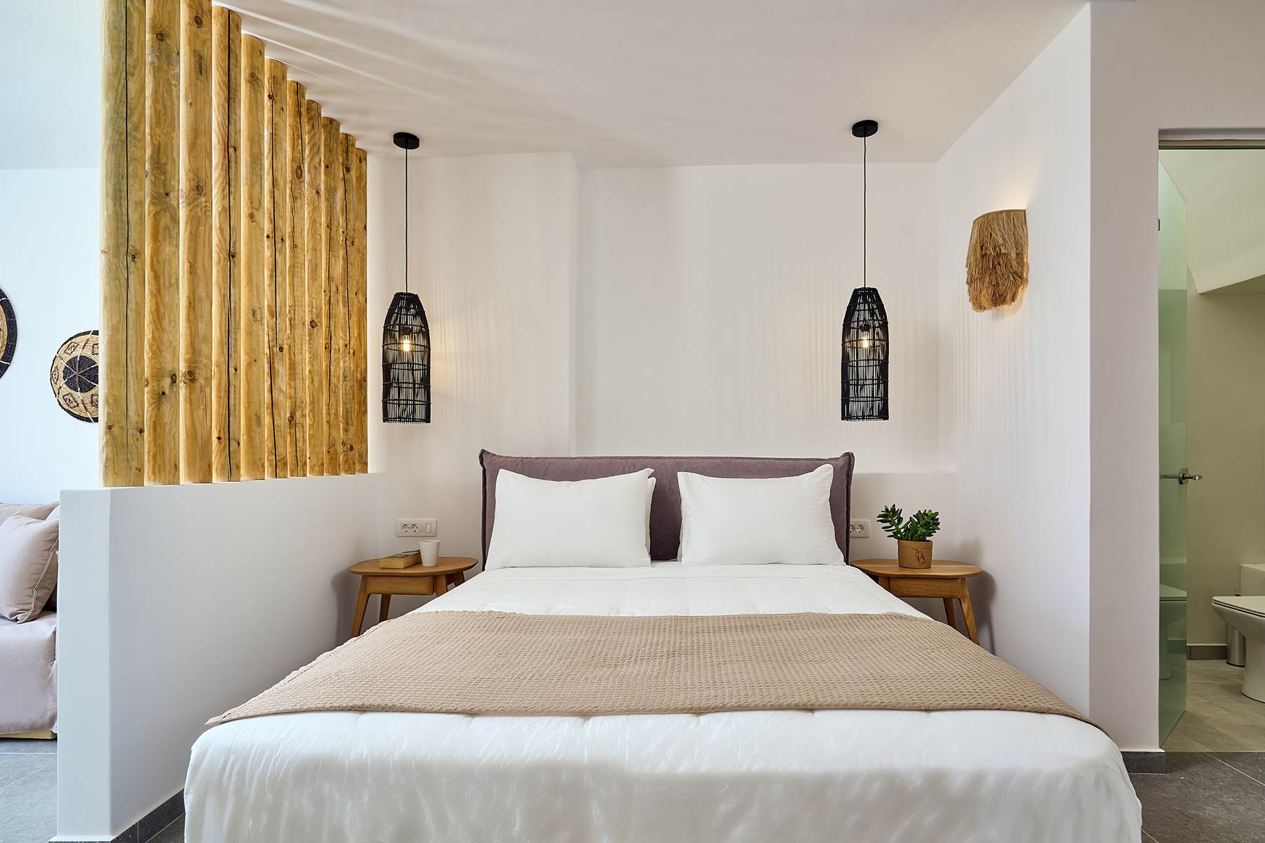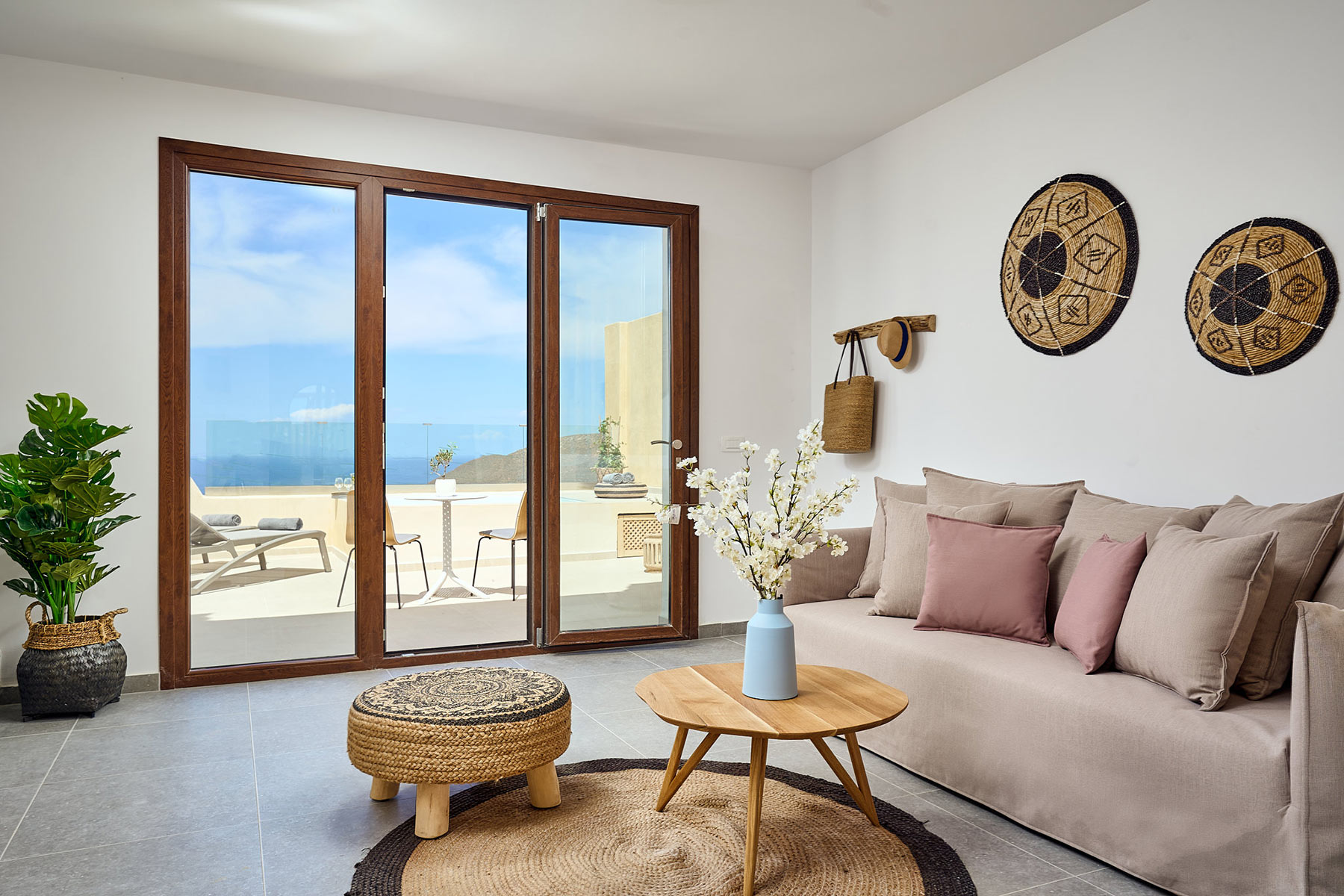 There’s a seducingly tranquil feel to the interior and exterior areas of this charming suite designed to comfortably host 3 guests. Indoors, modern vibes and minimalism emphasised by the functional, white, grey and wooden decorative details prevail, while the stunning sea and sunset view outdoors will offer you countless opportunities to revel in the beauty of the Aegean and the Cycladic landscape. The bare and dry slopes of Anafi and the ethereal outline of Santorini appearing on the horizon ideally complete the picture, while the relaxing private outdoor petite plunge pool promises moments so relaxing that you will remember forever!